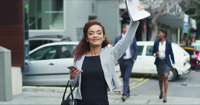 Business woman, city street and hail a taxi or cab while walking with a smile after work. African female person walk on an urban road outdoor for travel, transport and professional career
