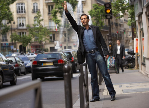 A professional hailing a taxi outside a modern hotel Documents peek out from their briefcase The mood feels dynamic and on the move, Generative AI