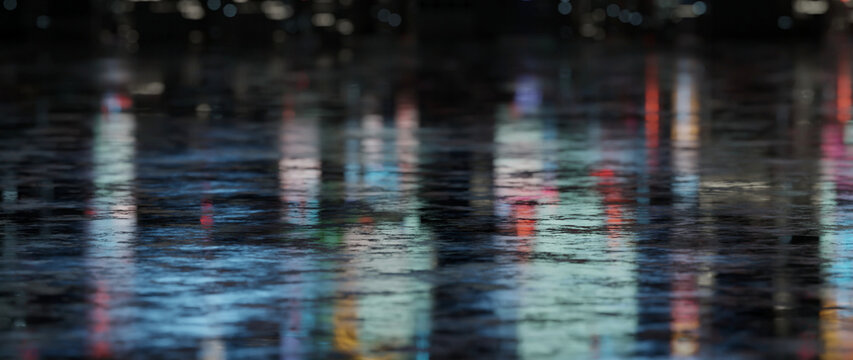 Dark street, wet asphalt, reflections of rays in the water. Abstract dark blue background, smoke, smog. Empty dark scene, neon light, spotlights. Concrete floor