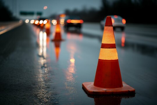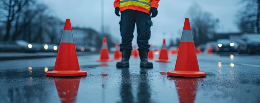 Enhance your road safety with our professional images featuring a Worker placing cones at infrastructure project High-visibility safety gear visible ensures worker protection, critical for traffic