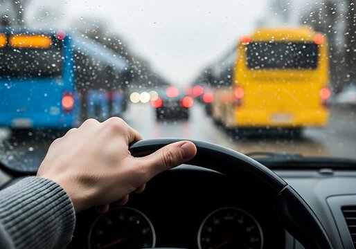 Detailed POV of a driver's hand gripping the steering wheel in urban traffic during heavy winter weather, suitable for road safety, insurance, and automotive travel advertising campaigns