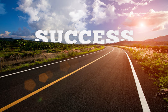 success behind the tree of empty asphalt road at golden sunset and beautiful blue sky. Success concept.
