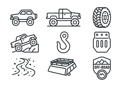 Off-road vehicle icon set: 9 linear designs for adventure enthusiasts