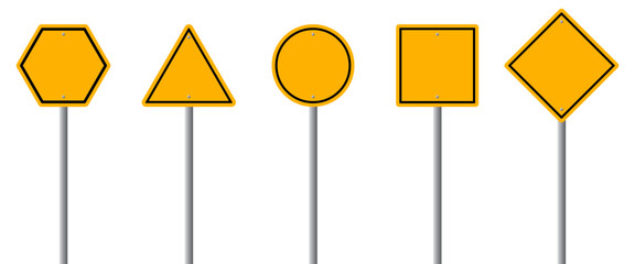Set of blank yellow road sign. Empty traffic signs isolated on transparent background. Highway attention roadsign collection.