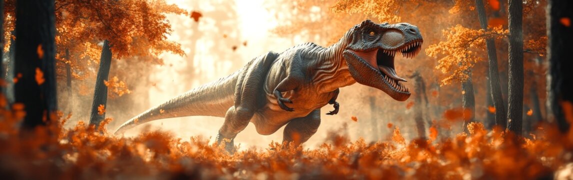 Dramatic illustration of a roaring T-Rex dinosaur in a lush green setting, showcasing its powerful build and fierce facial expression. Ideal for nature and prehistoric themed visuals.