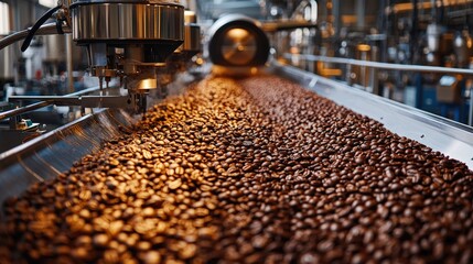 Conveyor belt transporting roasted coffee beans in a processing facility.