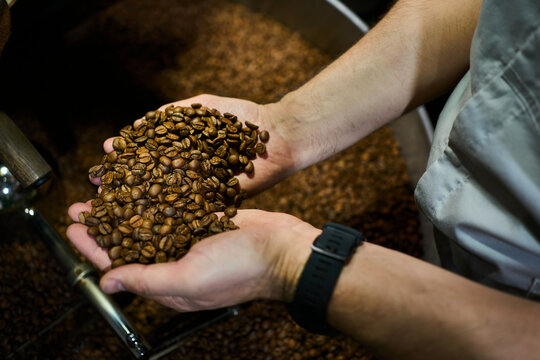 Barista inspecting freshly roasted coffee beans in a roasting facility
