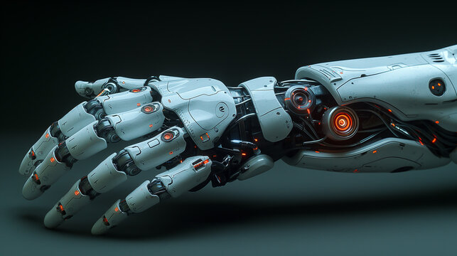 A robotic arm with glowing red lights, against a dark background, symbolizing the advancement of technology.