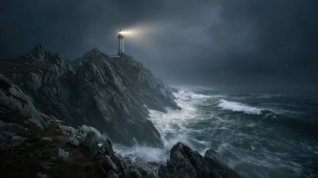 A striking photo of a lonely lighthouse on steep rocks, piercing the thick fog with a beam of light, with dramatic waves crashing below, a dark romantic atmosphere