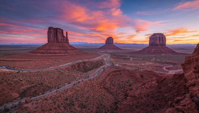 Stunning view of a valley featuring red rock formations and expansive desert landscape, ideal for travel and nature themes