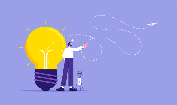 Businesswoman riding a rocket powered by a bright idea lightbulb