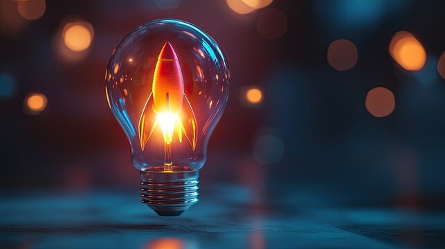 A 3D rocket with light bulbs around flying in space against a dark blue background representing new idea and innovative technology business project concepts.