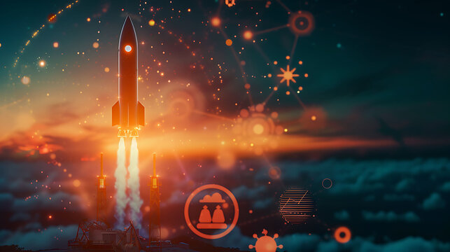 A space rocket blasting off from a laptop screen, symbolizing the launch of new ideas powered by generative AI and tech advancements