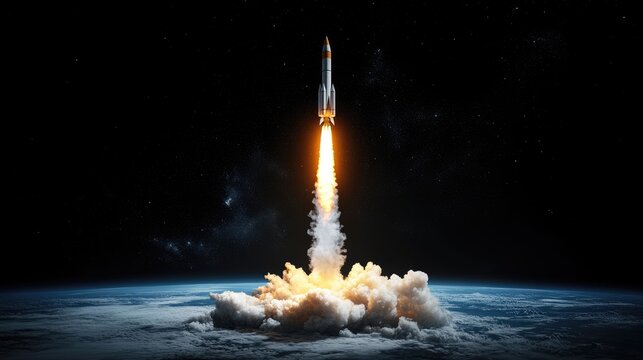 Digital rendering of rocket missile launch with fiery propulsion trail over black space backdrop