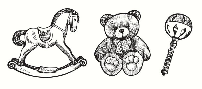 Retro toy collection. Rocking horse, side view, Teddy bear, Beanbag. Ink black and white doodle drawing in woodcut style