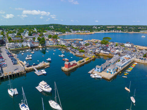 Rockport Harbor aerial view including Bearskin Neck and Motif Number 1 building in historic waterfront village of Rockport, Massachusetts MA, USA.