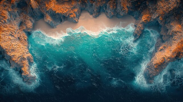 top view of the rocky coast in a storm, azure water and waves near the shore