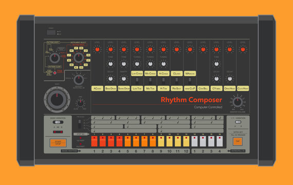 Classic vintage Rhythm Composer instrument on orange background. Analog synth. Vector illustration.