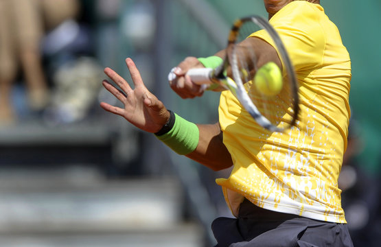Tennis action shot of a racket hitting a ball on a clay court at roland garros dynamic image sport environment close-up view athletic concept
