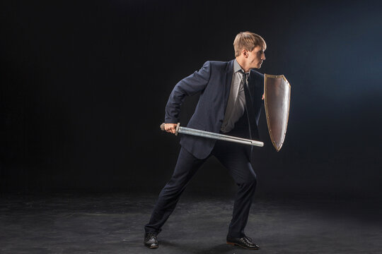 In a dramatic studio pose, a man in a navy suit stands poised with a sword and shield. The dark background emphasizes the contrast between corporate and medieval imagery.