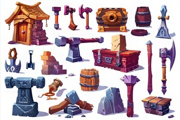 D20 dice paired with a battle axe in strategy Dnd fantasy game. Tabletop roleplay set designed for adventure-themed cartoon stickers.