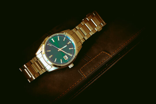 Close Up Of Stylish Luxury Man Wrist Watch With Moving Hand And Multiple Dials. Men's chronograph watch in metal with sapphire crystal. closeup view of rotating watch, running second arrow. green dial