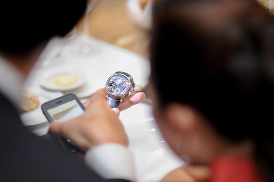 A Close-up of a man's hands wiping a leather strap wristwatch with a special cloth. Expensive wristwatches that convey status.