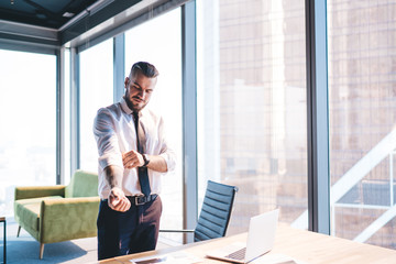 Pull up banner mockup stands in the elegant building hallway. Blank roll up poster for advertising or marketing message in modern interior