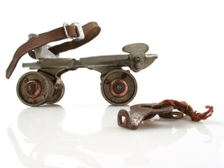 Close up photo of woman's body part. Legs wearing cute sweet with shoelaces four wheeled roller blades isolated tanned bright vivid background