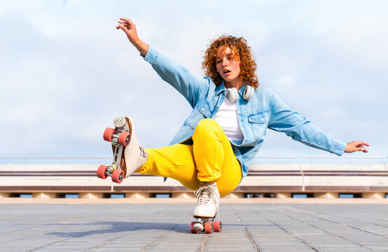 Beautiful red haired young woman with rollerskates having fun outdoors