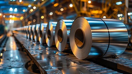 A row of aluminum rolls is situated in the production area of a factory