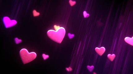 Glowing pink hearts floating on a black background, with cartoon cute heart-shaped bokeh, creating a romantic Valentine's Day atmosphere