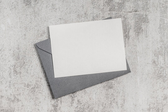 Gray envelope with blank card on concrete background. Invitation, greeting card mockup.