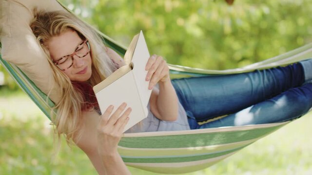 Smiling blonde woman with eyeglasses reading a book, relaxing on the hammock in garden, leisure time and summer holiday concept