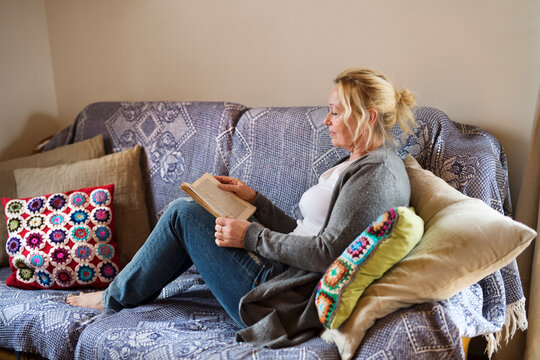Beautiful mature woman reading book, feeling cozy and happy. Weekend activity for older woman, relaxing at home.