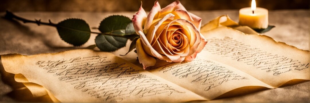 A nostalgic composition featuring an antique book with a crimson rose, symbolizing romance and memoirs.