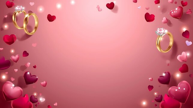 "Luxury Valentine vector background with elegant gold engagement rings, soft pink–red gradients, glowing romantic lights, floating hearts, rose petals, and a clean empty space for text. Premium, uniqu