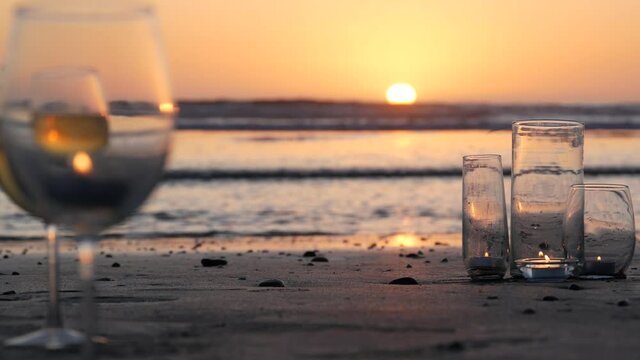 Romantic couple at beach during sunset with overlay text
