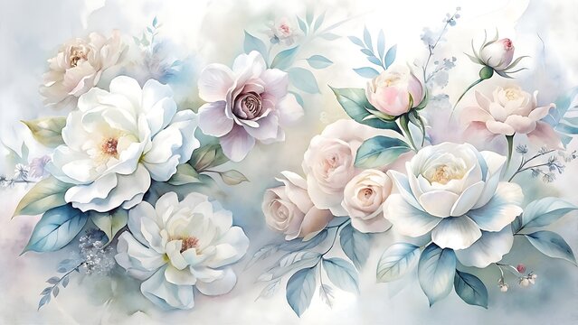 Romantic watercolor floral arrangement on a white backdrop, suitable for editorial header background