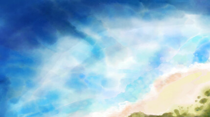 Vector illustration of tropical beach in daytime. Hand painted watercolor background.