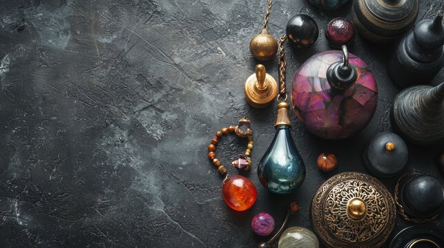 Vintage style oriental perfume bottles on dark textured background for luxury fragrance branding and antique decor photography