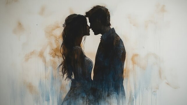 Silhouettes of a couple embracing against a background of soft muted watercolors and drips. .
