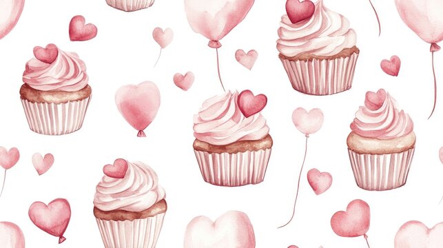 Watercolor romantic pattern featuring cupcakes and heart balloons Seamless digital paper design