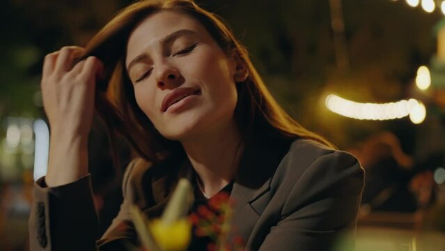 Beautiful woman sitting at cafe table on romantic date in evening. Attractive female on meeting in outdoor restaurant and city lights on background