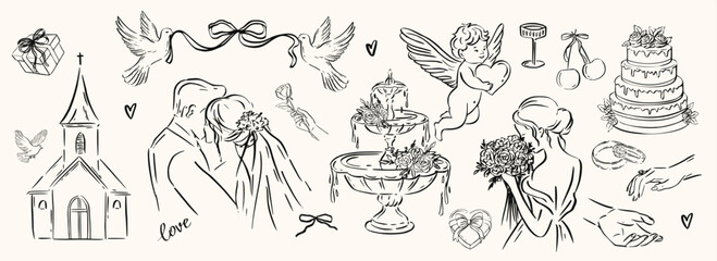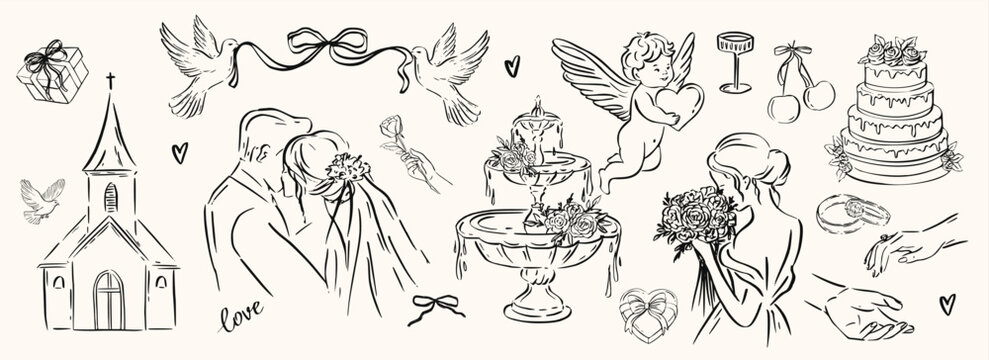Hand drawn ink wedding celebration set. Couple, church, cake, doves, cupid, bouquet, wine glass for invitations, romantic love branding. Elegant whimsical vintage sketch style.