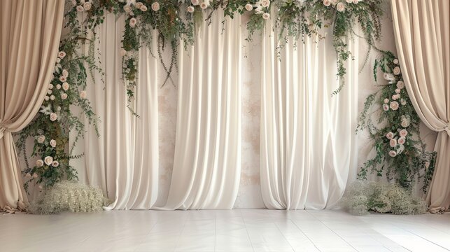 Romantic Floral Archway: A rustic-chic wedding backdrop featuring a stunning floral archway and flanking arrangements, bursting with creamy roses, delicate foliage, and earthy tones.