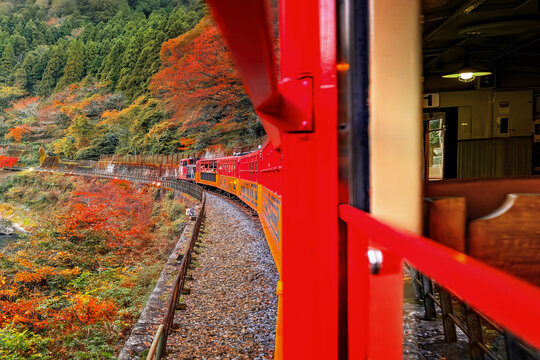 Kyoto, Japan - November 21 2024: Sagano Romantic Train with beautiful foliage in autumn in Kyoto, Japan