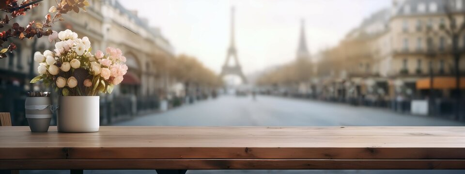 Beautiful blooms in rustic pots on a table with a sunny Paris street in soft focus, banner, design template, travel and lifestyle