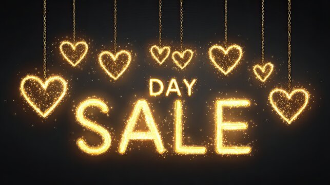 Golden sparkling hearts and glowing day sale text on black background for romantic discount promotion