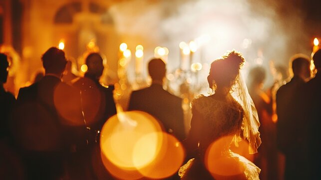 Romantic wedding scene with guests in silhouette, soft candlelight ambience creating an enchanting atmosphere for a memorable celebration.